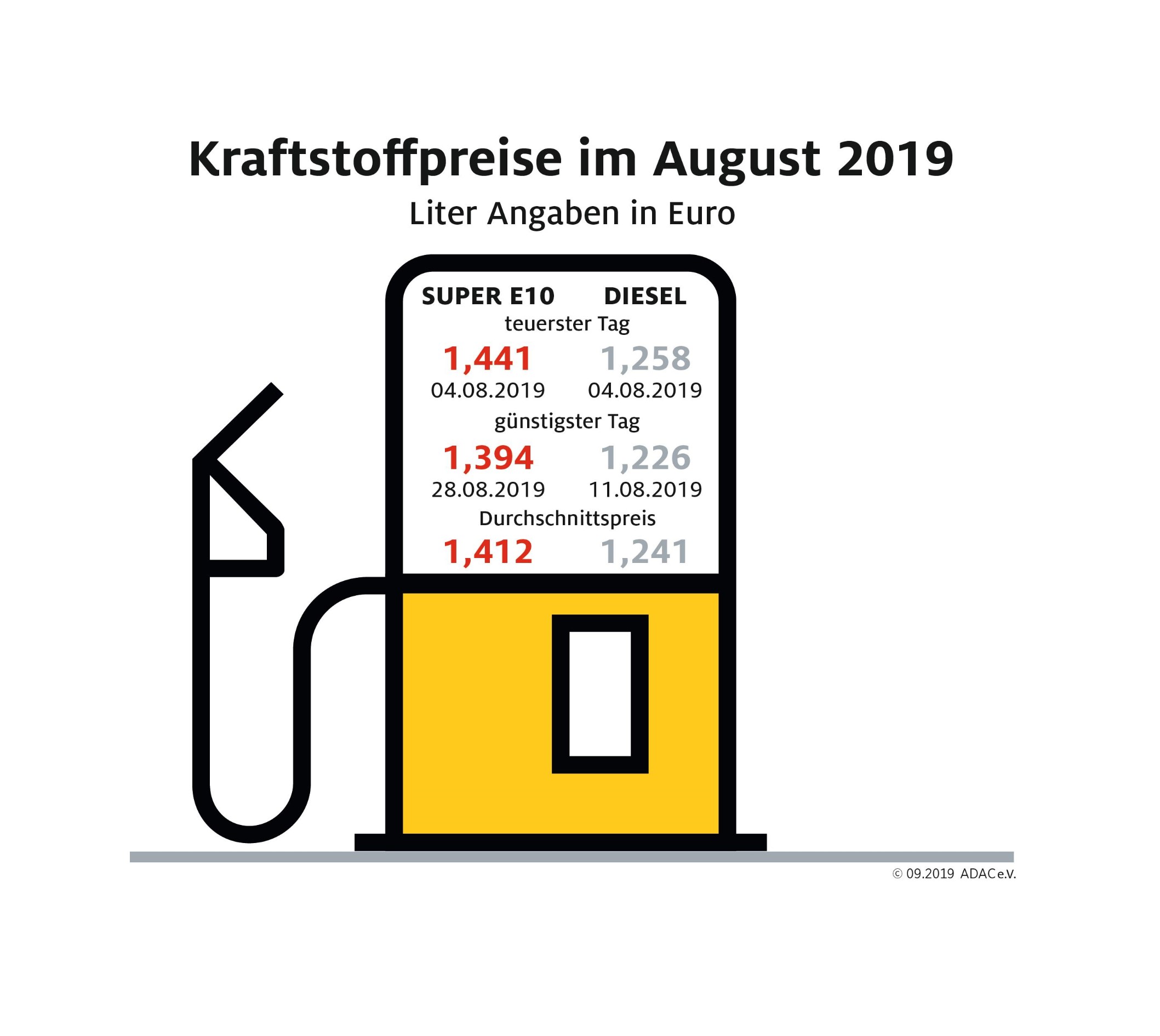 Teuerster Tanktag im vergangenen Monat war für beide Sorten der 4. August. An diesem Tag mussten Autofahrer für einen Liter Super E10 durchschnittlich 1,441 Euro und für einen Liter Diesel 1,258 Euro bezahlen. Am günstigsten war Super E10 im bundesweiten Mittel mit 1,394 Euro je Liter am 28. August, bei Diesel wurde der Monatstiefststand mit 1,226 Euro je Liter am 11. August erreicht.