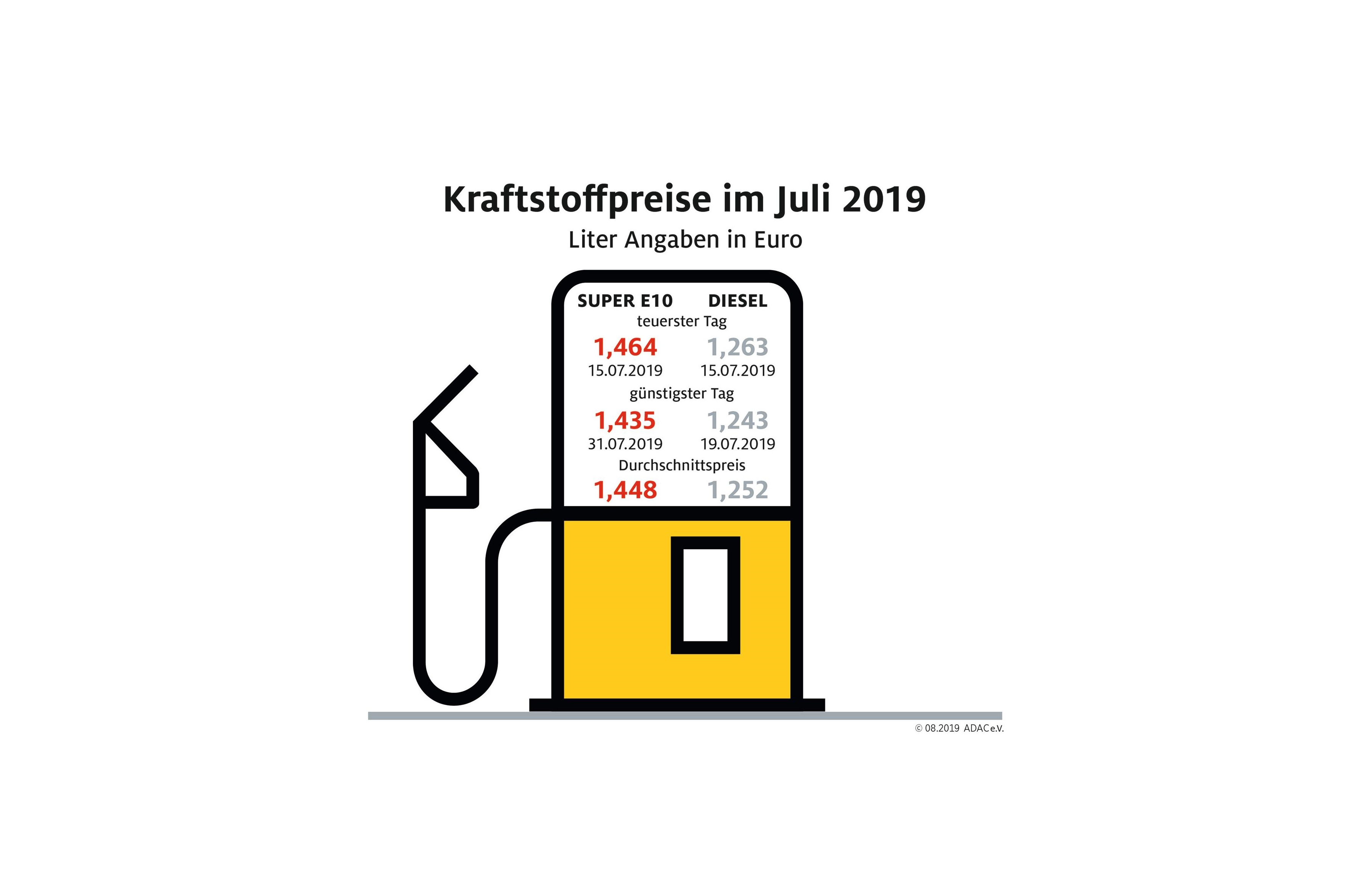 Teuerster Tanktag im vergangenen Monat war für beide Sorten der 15. Juli. An diesem Tag mussten Autofahrer für einen Liter Super E10 durchschnittlich 1,464 Euro und für einen Liter Diesel 1,263 Euro bezahlen. Am günstigsten war Super E10 mit 1,435 Euro je Liter am 31. Juli, bei Diesel wurde der Monatstiefststand im bundesweiten Mittel mit 1,243 Euro je Liter am 19. Juli erreicht.