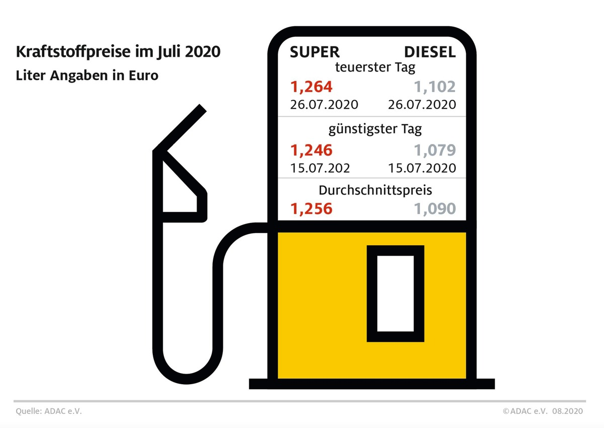 München (ots) – Autofahrer mussten im Juli für Benzin und Diesel im Bundesdurchschnitt mehr als im Juni bezahlen. Laut der monatlichen Marktauswertung des ADAC kostete ein Liter Super E10 im Bundesmittel 1,256 Euro, das sind 1,7 Cent mehr als im Vormonat. Diesel verteuerte sich um 0,4 Cent auf durchschnittlich 1,090 Euro je Liter.