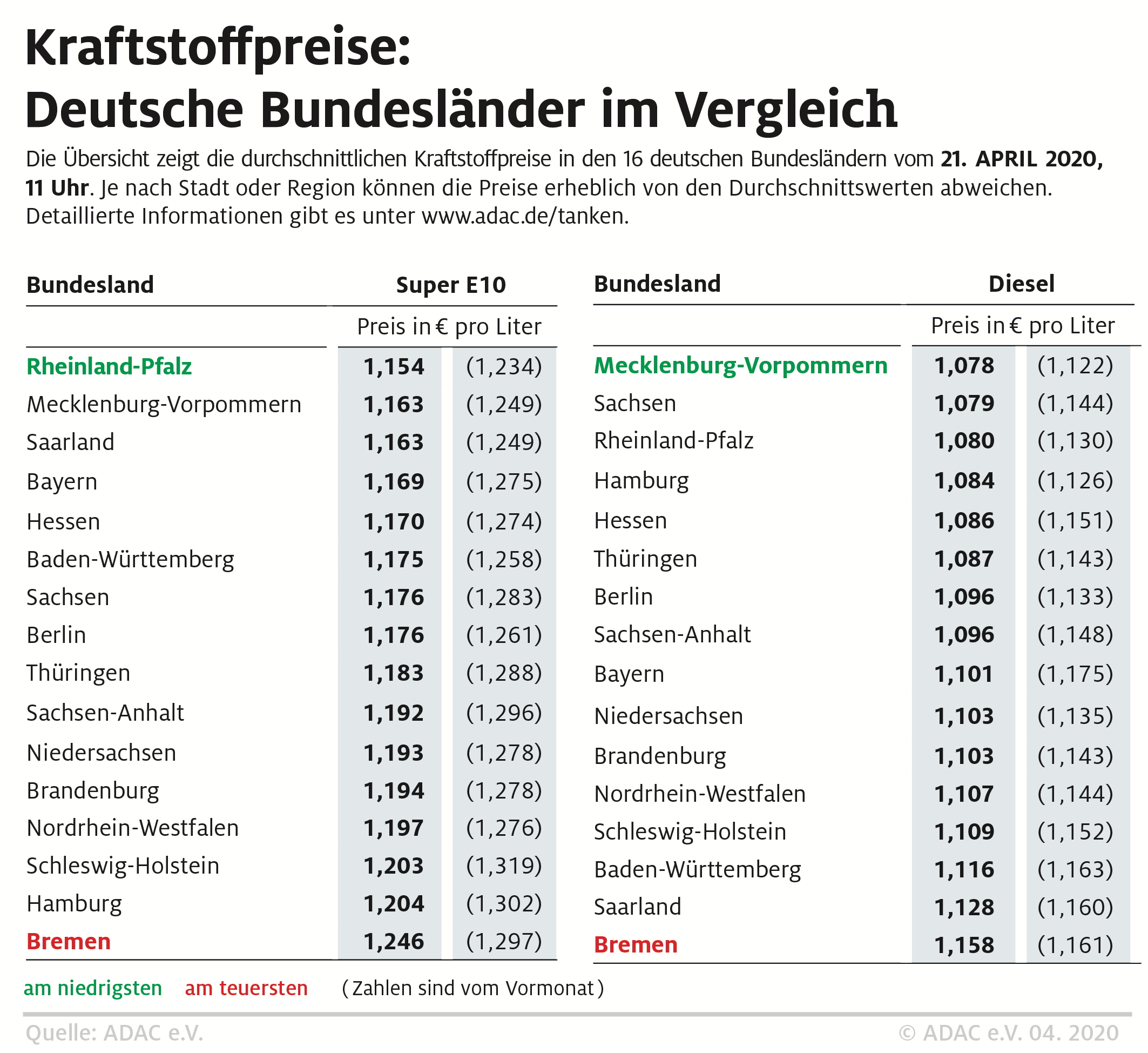 München (ots) – Während durch die weltweite Corona-Krise die Kraftstoff-Nachfrage einbricht, werden die regionalen Preisunterschiede bei Benzin und Diesel größer. Super E10 tanken Autofahrer derzeit in Rheinland-Pfalz am günstigsten. Laut aktuellem Bundesländervergleich kostet ein Liter dort durchschnittlich 1,154 Euro. Auf Platz 2 mit jeweils 1,163 Euro je Liter folgen das Saarland und Mecklenburg-Vorpommern. Schlusslicht ist der Stadtstaat Bremen, wo man für einen Liter Super E10 im Mittel 1,246 Euro und damit 9,2 Cent mehr als in Rheinland-Pfalz bezahlen muss. Bei einer 40-Liter-Tankfüllung ergeben sich dadurch Mehrkosten von immerhin 3,68 Euro.