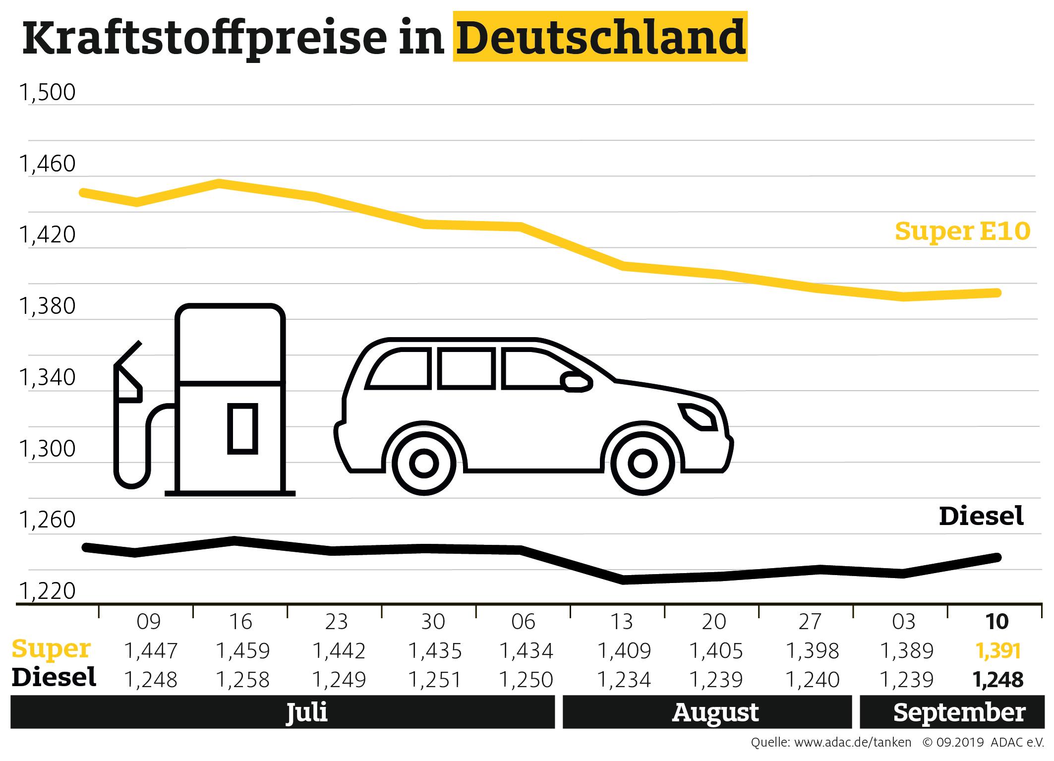 Nachdem die Benzinpreise im Bundesdurchschnitt zuletzt sieben Wochen in Folge gesunken waren, ziehen sie nun wieder leicht an. Laut aktueller Auswertung des ADAC kostet ein Liter Super E10 derzeit im Bundesmittel 1,391 Euro, das sind immerhin 0,2 Cent mehr als in der Vorwoche. Diesel verteuerte sich deutlich auf durchschnittlich 1,248 Euro je Liter, ein Anstieg von 0,9 Cent.