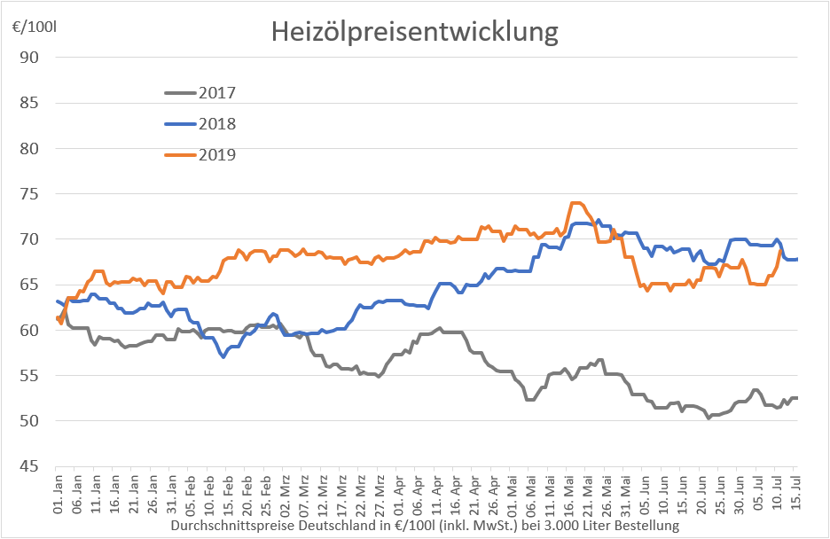Hinweis: Die genannten Heizölpreise beziehen sich stets auf den deutschlandweiten Durchschnittspreis bei einer Bestellung von 3.000 Liter Heizöl Standard schwefelarm inklusive 19% MwSt.. Durch Transportkosten fallen die Preise regional jedoch unterschiedlich aus. Die Preisspanne zwischen den Regionen kann daher momentan bei bis zu ca. 4,17 Euro pro 100 Liter liegen. Stand der Preise: 11.07.2019